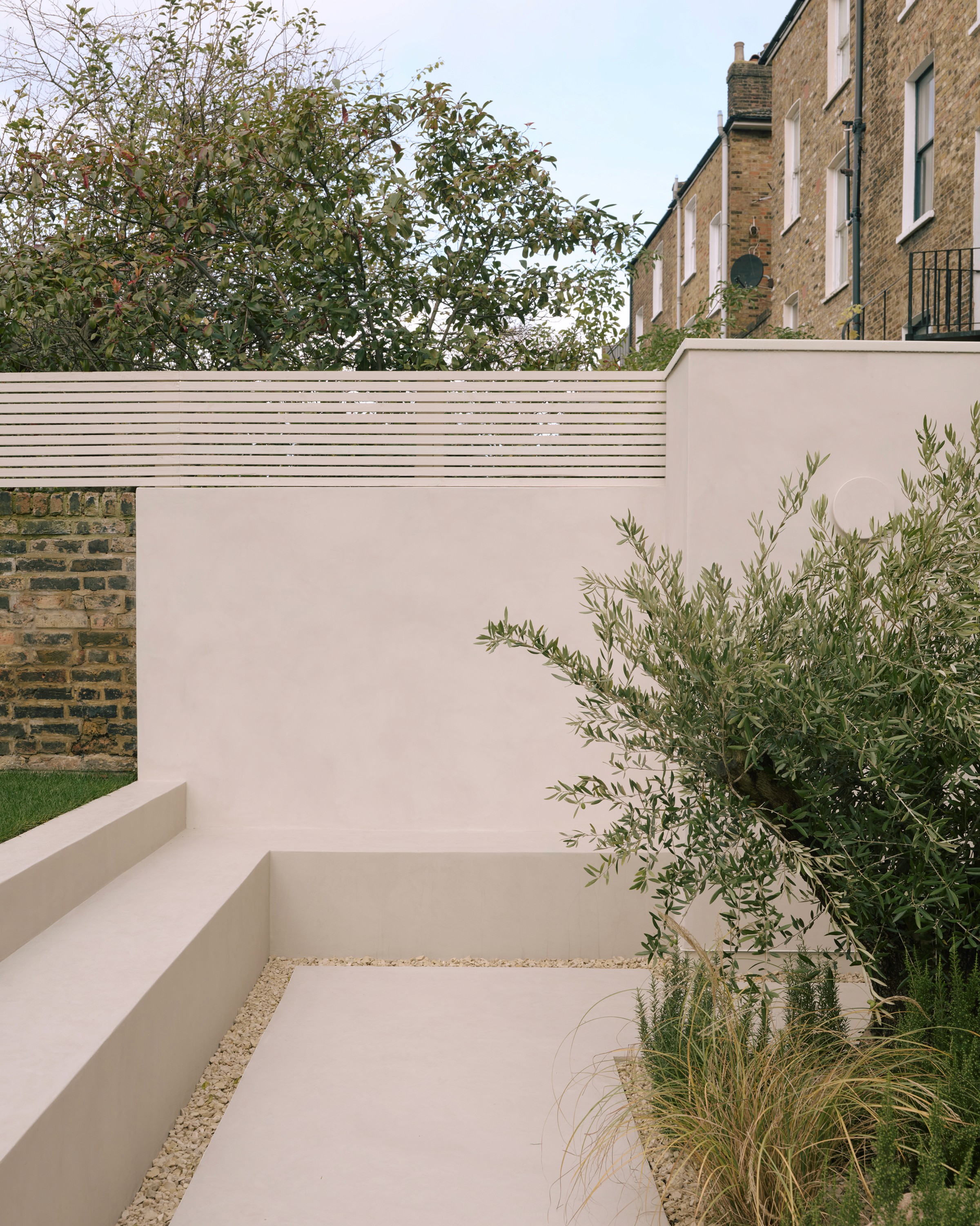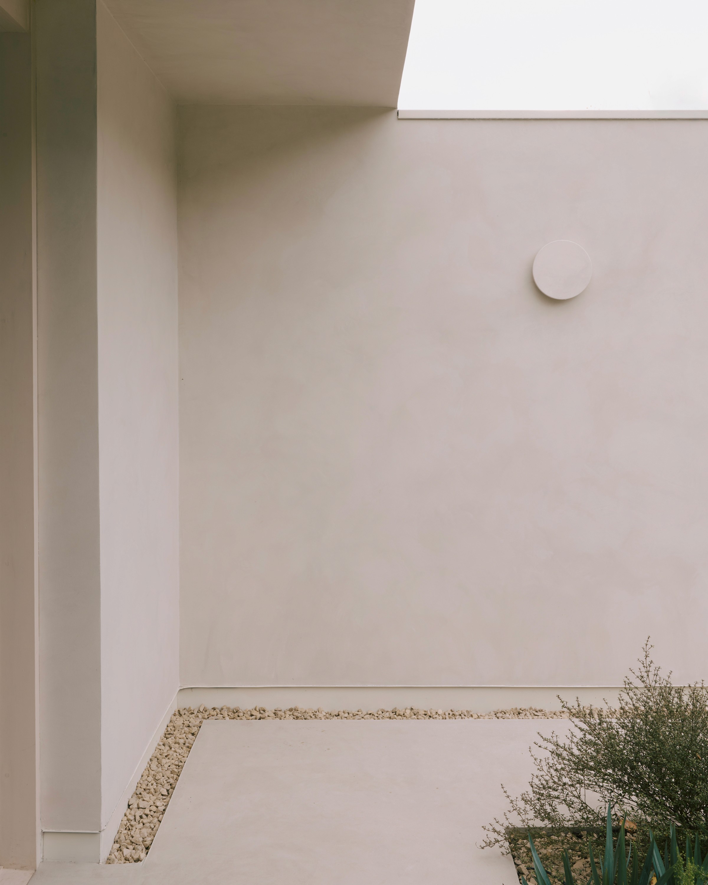 The scope focused on creating a cohesive exterior courtyard that visually connects the architecture, landscaping, and circulation paths into a single, unified composition. Using microcement and mineral-based plaster systems, the exterior walls, pathways, and built elements were finished in a soft, neutral tone that complements both the surrounding brickwork and natural planting.