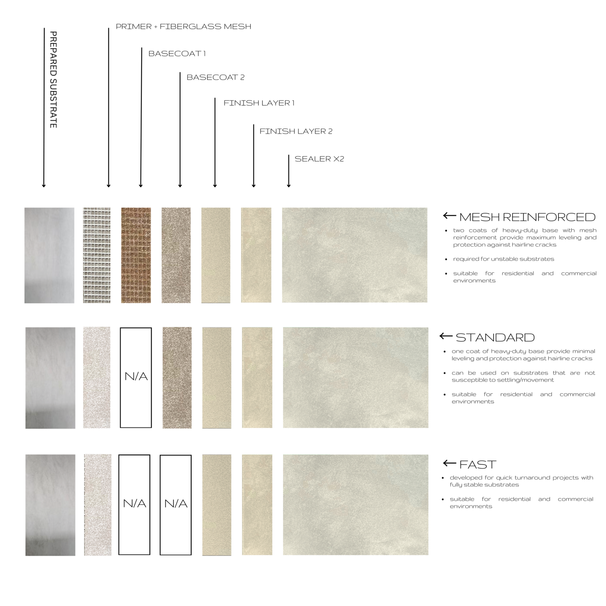 We offer three different types of systems suitable for residential floors. Each type is designed to work with various different floor substrates. You will notice that that the last 4 layers of each system are identical, which means that finish quality and performance will not change regardless of the systems you use. We never compromise performance or durability of our products.
